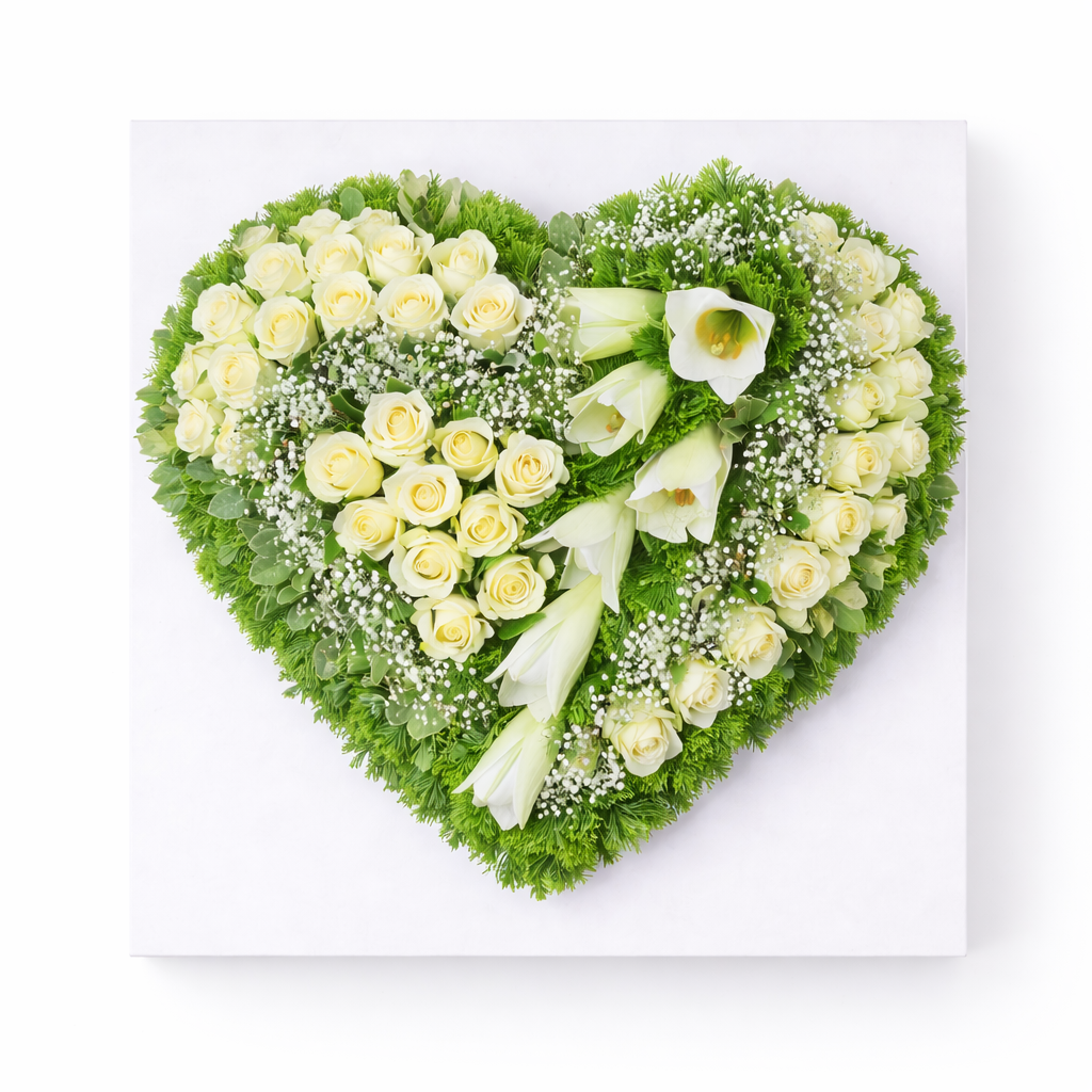 Gruppiert gestecktes, stehendes Herz mit weißen Rosen, weißen Lilien,