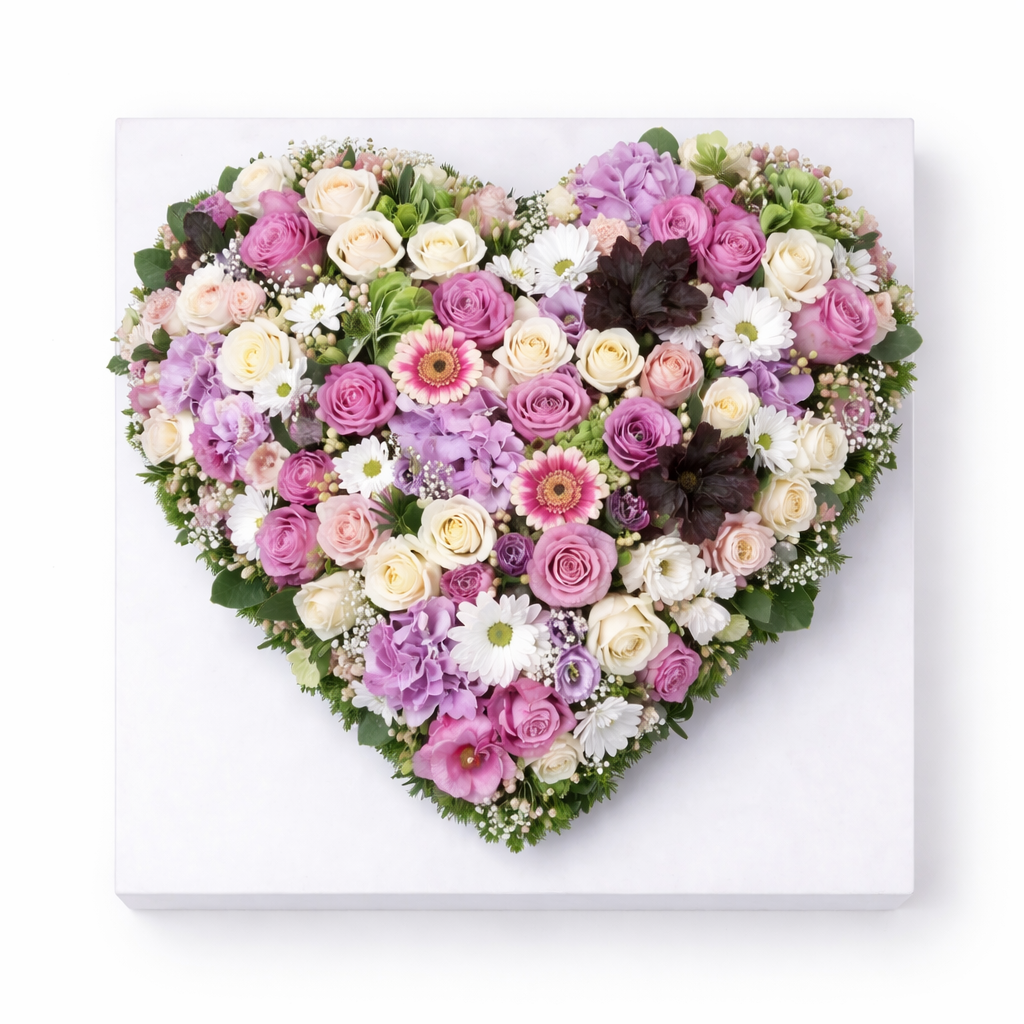 Herz mit Blumen der Saison in den Farben creme, weiß, rosa und violett.